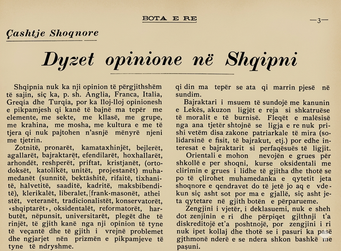 Shqipnia nuk ka nji opinion të përgjithshëm të sajin, siç ka, p. sh. Anglia, Franca, Italia, Greqia dhe Turqia, por ka lloj-lloj opinionesh e pikpamjesh qi kanë të bajnë ma tepër me elemente, me sekte, me klasë, me grupe, me krahina, me mosha, me kultura e me të tjera qi nuk pajtohen n’asnjë mënyrë njeni me tjetrin.